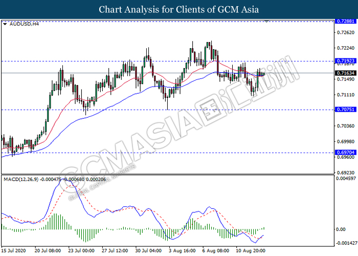 AUDUSD, H4: AUDUSD was traded higher following prior rebound from its low level. MACD which illustrate bullish momentum signal with the formation of golden cross suggest the pair to extend its gains towards the resistance level 0.7190.