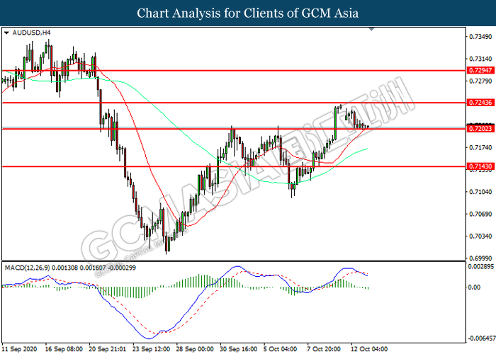 AUDUSD, H4: AUDUSD was traded lower while currently testing the support level at 0.7200. MACD which illustrated increasing bearish momentum suggest the pair to extend its losses after it successfully breakout below the support level.