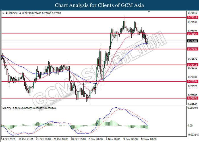 AUDUSD, H4: AUDUSD was traded lower following prior breakout below the previous support level at 0.7265. MACD which illustrate bearish bias momentum suggest the pair to extend its losses toward the support level at 0.7205.