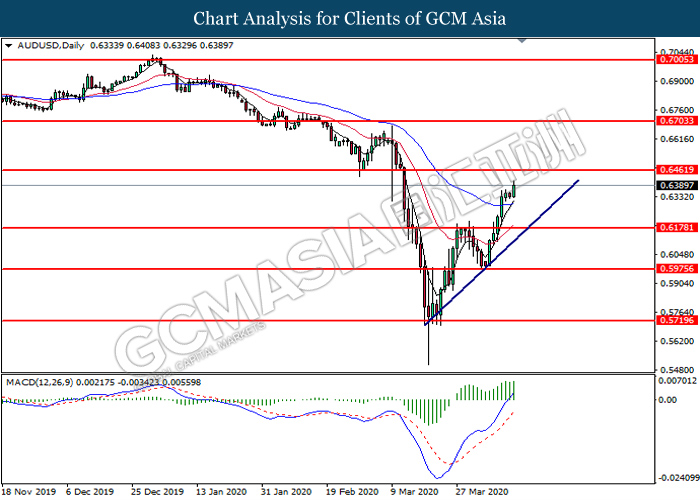 AUDUSD, Daily: AUDUSD was traded higher following prior breakout above the previous resistance level at 0.6180. MACD which illustrate bullish bias momentum suggest the pair to extend its gains toward the next resistance level at 0.6460.