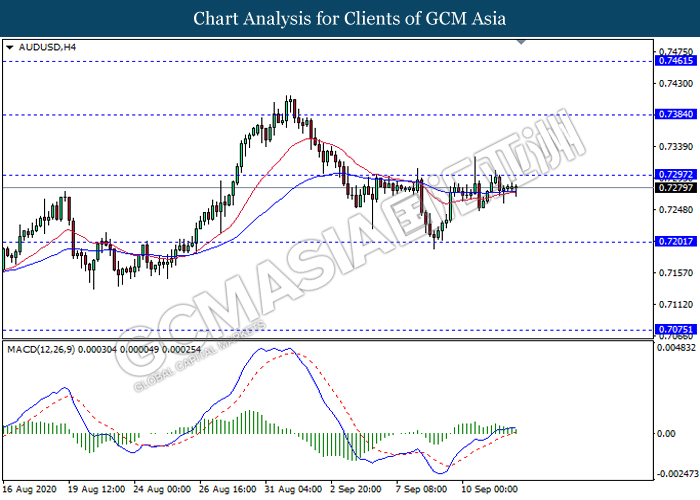 AUDUSD, H4: AUDUSD was traded flat while currently testing near the resistance level 0.7295. However, MACD which illustrate diminishing bullish momentum signal suggest the pair to be traded lower towards the support level 0.7200.