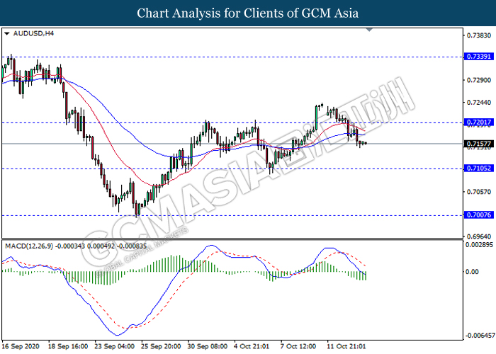 AUDUSD, H4: AUDUSD was traded lower following recent breakout below the previous support level 0.7200. MACD which illustrate bearish momentum signal suggest the pair to extend its losses towards the support level 0.7105.