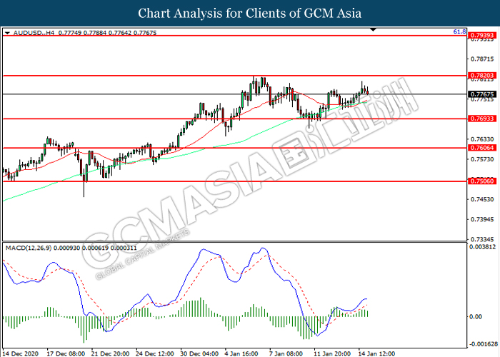 AUDUSD, H4: AUDUSD was traded higher following prior rebound from the support level at 0.7695. However, MACD which illustrated diminishing bullish momentum suggest the pair to be traded lower in short-term as technical correction.