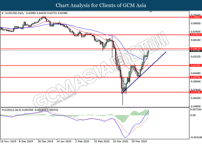 AUDUSD, Daily: AUDUSD was traded higher following prior breakout above the previous resistance level at 0.6180. MACD which illustrate bullish bias momentum suggest the pair to extend its gains toward the next resistance level at 0.6460.