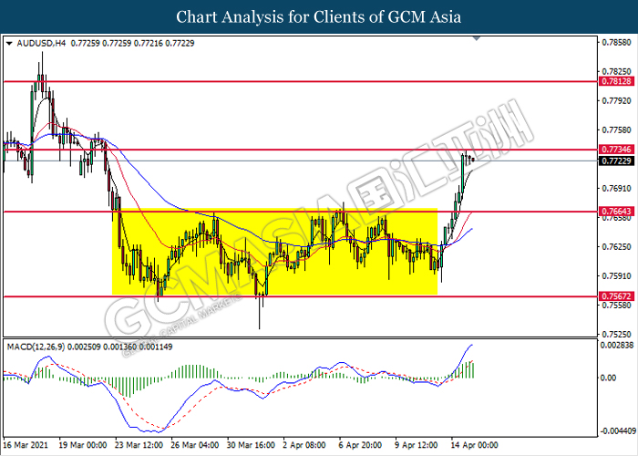 AUDUSD, H4: AUDUSD was traded higher while currently testing the resistance level at 0.7735. MACD which illustrated bullish bias momentum suggest the pair to extend its gains after it successfully breakout above the resistance level at 0.7735.