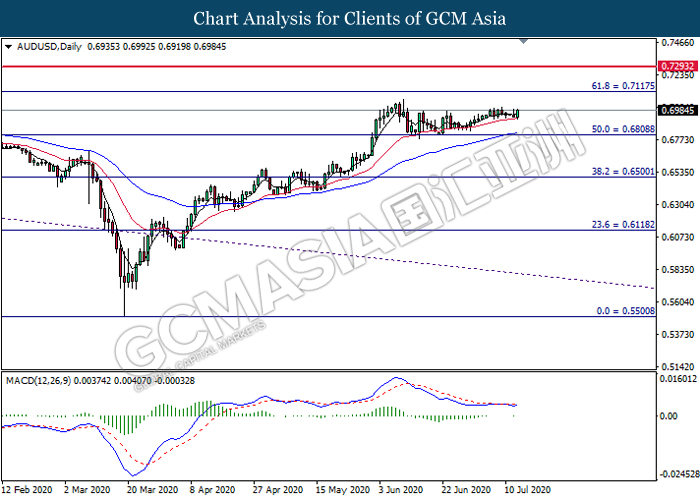 AUDUSD, Daily: AUDUSD was traded higher following prior rebound from the 20 moving average line (Red). Due to lack of signal from MACD, it is suggested to wait for further confirmation before entering into the market.
