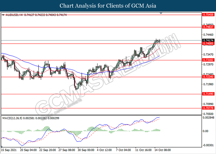 AUDUSD, H4: AUDUSD was traded higher following prior breakout above previous resistance level 0.7400. However, MACD which illustrate diminishing bullish momentum signal suggest the pair to experience a technical correction after it breaks back below the level.