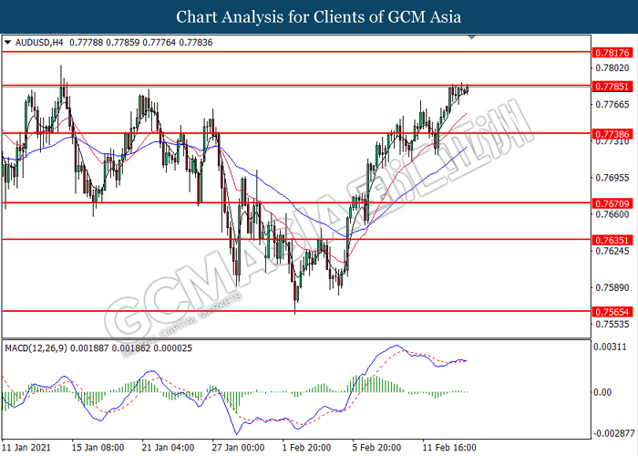 AUDUSD, H4: AUDUSD was traded higher while currently testing the resistance level at 0.7785. MACD which illustrated bullish bias momentum suggest the pair to extend its gains after it successfully breakout above the resistance level.