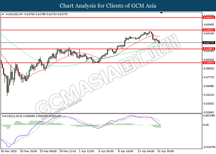 AUDUSD, H4: AUDUSD was traded lower following prior retracement from the resistance level at 0.6460. MACD which illustrated increasing bearish momentum suggest the pair to extend its losses toward support level at 0.6185.