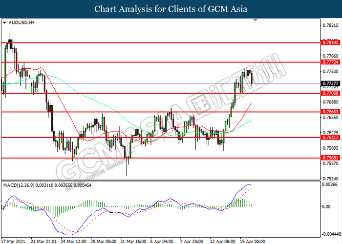 AUDUSD, H4: AUDUSD was traded lower following prior retracement from the resistance level at 0.7770. MACD which illustrated diminishing bullish momentum suggest the pair to extend its losses toward support level at 0.7705.
