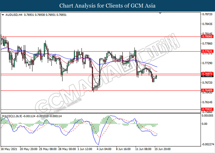 AUDUSD, H4: AUDUSD was traded higher while currently testing the resistance level 0.7395. MACD which illustrate diminishing bearish momentum signal suggest the pair to extend its gains after it breaks above the resistance level.