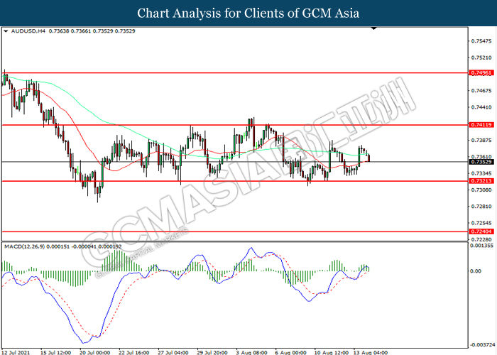 AUDUSD, H4: AUDUSD was traded lower while currently near the support level at 0.7320. MACD which illustrated diminishing bullish momentum suggest the pair to extend its losses after it successfully breakout below the support level.