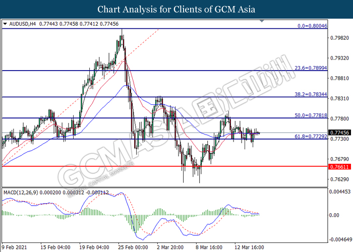 AUDUSD, H4: AUDUSD was traded higher following prior rebound from the support level at 0.7730. MACD which illustrated diminishing bearish momentum suggest the pair to extend its gains toward the resistance level at 0.7780.