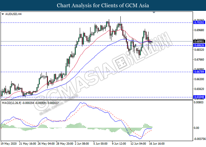 AUDUSD, H4: AUDUSD was traded lower while currently testing near the support level 0.6860. MACD which illustrate diminishing bullish momentum signal suggest the pair to extend its losses after it breaks below the support level 0.6260.