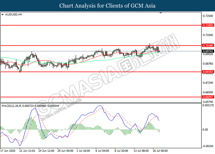 AUDUSD, H4: AUDUSD was traded within a range while currently testing the resistance level at 0.7020. However, MACD which illustrated increasing bearish momentum suggest the pair to be traded lower in short-term as technical correction.