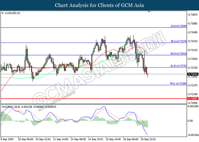 AUDUSD, H1: AUDUSD was traded lower following prior breakout below the previous support level at 0.7275. MACD which illustrated increasing bearish momentum suggest the pair to extend its losses toward support level at 0.7240.