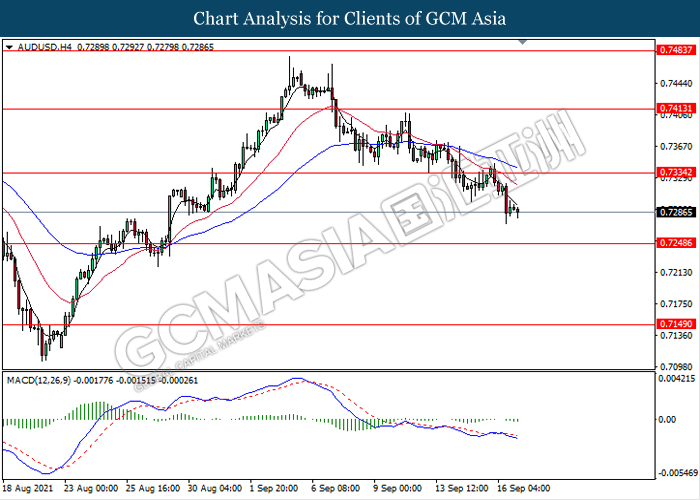 AUDUSD, H4: AUDUSD was traded lower following recent retracement from the resistance level 0.7335. MACD which illustrate bearish momentum signal suggest the pair to extend its losses towards the support level 0.7250.