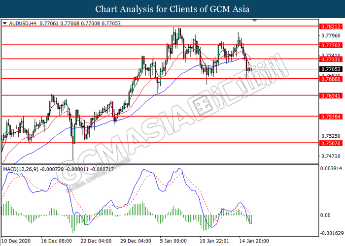AUDUSD, H4: AUDUSD was traded lower following prior breakout below the previous support level at 0.7735. MACD which illustrated bearish bias momentum suggest the pair to extend its losses toward the support level at 0.7680.