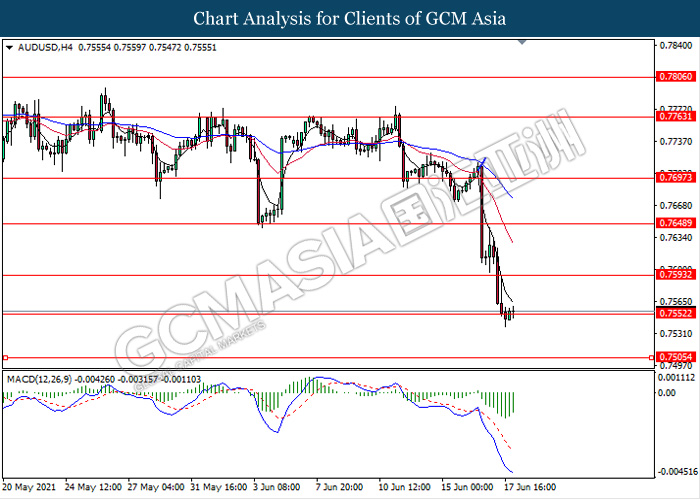 AUDUSD, H4: AUDUSD was traded lower while currently testing the support level 0. 7550.However, MACD which illustrate diminishing bearish momentum signal suggest the pair to be experience a technical correction towards the resistance level 0.7595.