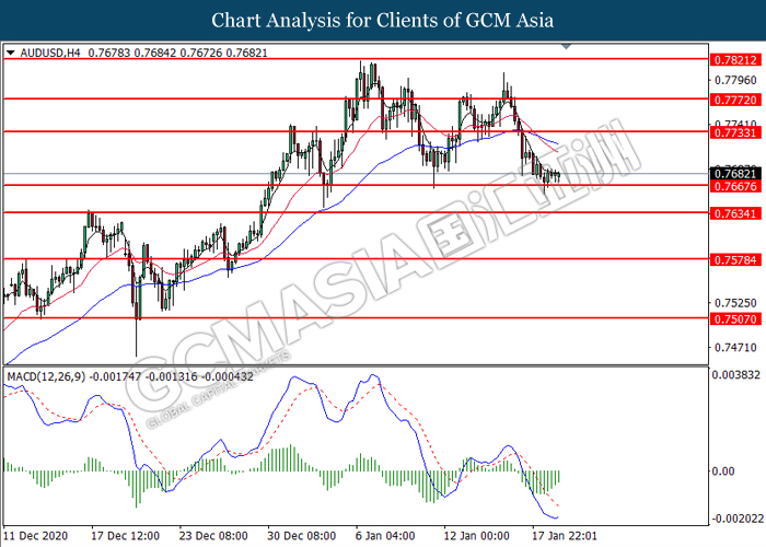 AUDUSD, H4: AUDUSD was traded higher following prior rebound from the support level at 0.7665. MACD which illustrated diminishing bearish momentum suggest the pair to extend its gains toward the resistance level at 0.7735.
