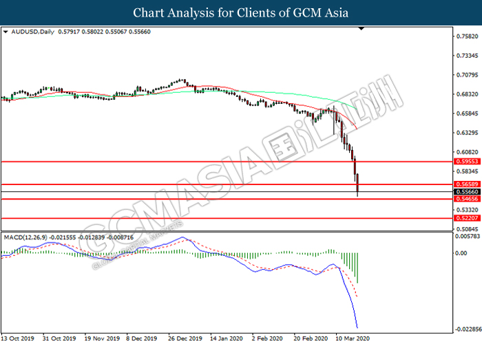 AUDUSD, Daily: AUDUSD was traded lower following prior breakout below the previous support level at 0.5660. MACD which illustrated increasing bearish momentum suggest the pair to extend its losses toward support level at 0.5465.