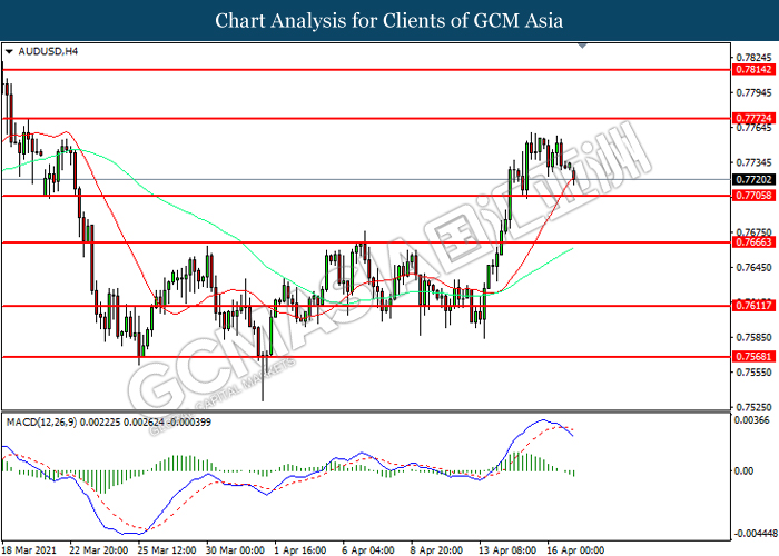 AUDUSD, H4: AUDUSD was traded lower while currently near the support level at 0.7705. MACD which illustrated increasing bearish momentum suggest the pair to extend its losses after it successfully breakout below the support level.