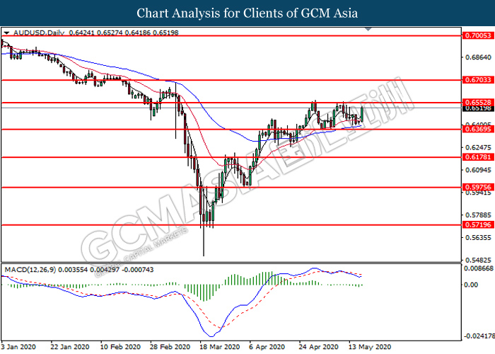 AUDUSD, Daily: AUDUSD was traded higher following prior rebound from the lower level. MACD which illustrates diminishing bearish momentum signal suggest the pair to extend its gains toward the resistance level at 0.6555.