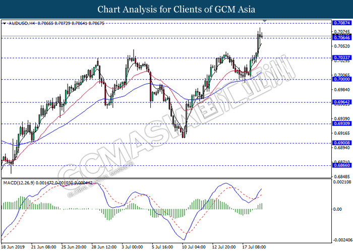AUDUSD, H4: AUDUSD was traded higher following prior breakout above the previous resistance level 0.7065. MACD which illustrate bullish momentum signal with the formation of golden cross suggest the pair to extend its gains towards the resistance level 0.7085.