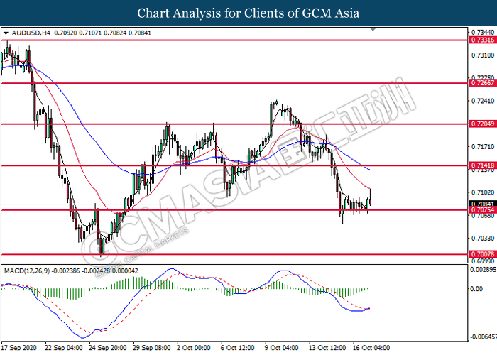 AUDUSD, H4: AUDUSD was traded higher following prior rebound from the support level at 0.7075. MACD which illustrate diminishing bearish momentum signal suggest the pair to extend its gains toward the resistance level at 0.7140.