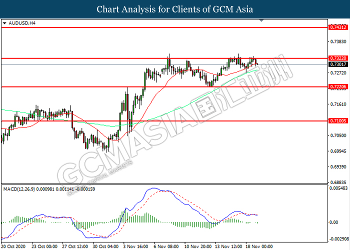 AUDUSD, H4: AUDUSD was traded within a range while currently testing the resistance level at 0.7320. MACD which illustrated increasing bearish momentum suggest the pair to be traded lower in short-term as technical correction.