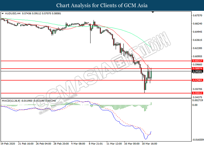 AUDUSD, H4: AUDUSD was traded higher while currently testing the resistance level at 0.5895. MACD which illustrated increasing bullish momentum suggest the pair to extend its gains after it successfully breakout above the resistance level.