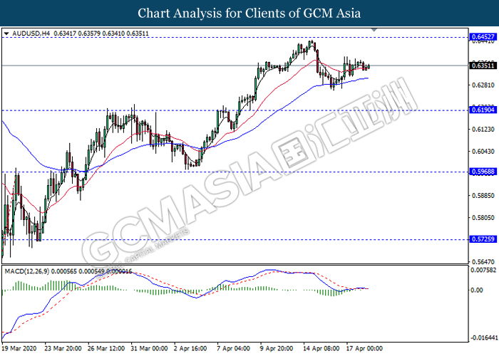 AUDUSD, H4: AUDUSD was traded flat near the MA lines. Due to lack of clear direction and momentum from MACD, it is suggested to wait until further signal appear before entering the market.