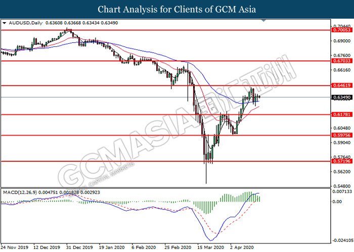 AUDUSD, Daily: AUDUSD was traded higher following prior rebound from the 50 moving average line (Blue). However, MACD which illustrate diminishing bullish momentum suggest the pair to undergo technical correction in short term toward the lower level.