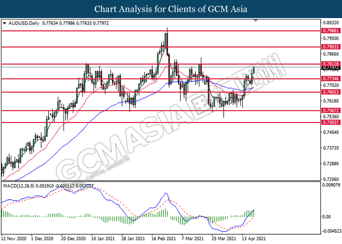 AUDUSD, Daily: AUDUSD was traded higher following prior breakout above the previous resistance level at 0.7735. MACD which illustrated bullish bias momentum suggest the pair to extend its gains toward the resistance level at 0.7815.