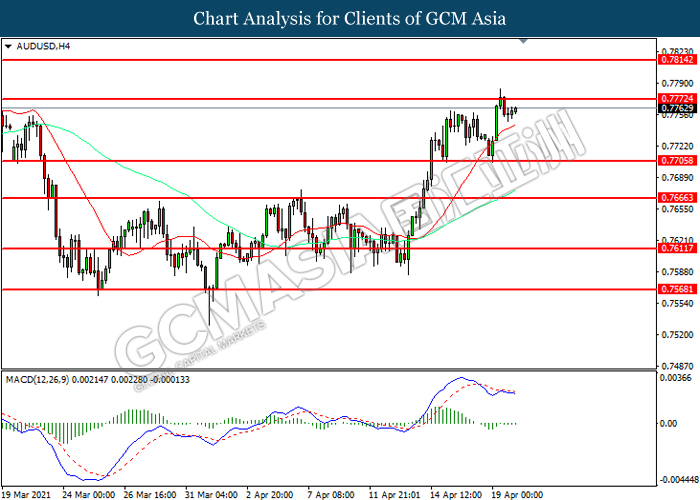 AUDUSD, H4: AUDUSD was traded lower following prior retracement from the resistance level at 0.7770. MACD which illustrated increasing bearish momentum suggest the pair to extend its losses toward support level at 0.7705.