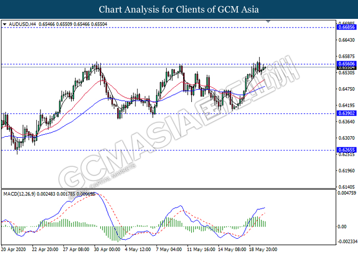 AUDUSD, H4: AUDUSD was traded higher while currently testing the resistance level 0.6560. However, MACD which illustrate diminishing bullish momentum signal suggest the pair may experience a short-term technical correction towards the support level 0.6390.