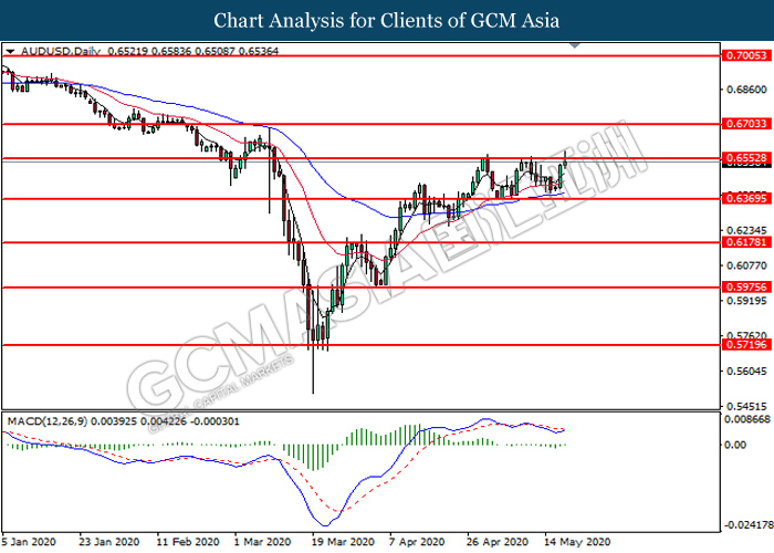 AUDUSD, Daily: AUDUSD was traded higher while currently testing the resistance level at 0.6555. MACD which illustrates diminishing bearish momentum signal suggest the pair to extend its gains after it successfully breakout above the resistance level.