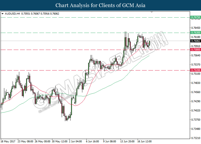 AUDUSD, H4: AUDUSD were traded higher following prior rebound from the strong support level near 0.7580. A closure above the 20-moving average line (red) suggests further upward bias to advance towards the target of resistance level at 0.7630.