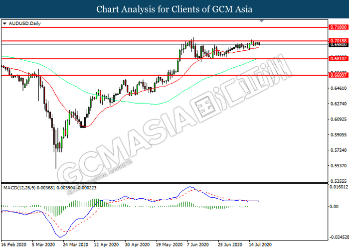 AUDUSD, Daily: AUDUSD was traded higher while currently testing the resistance level at 0.7020. However, MACD which illustrated increasing bearish momentum suggest the pair to be traded lower in short-term as technical correction.