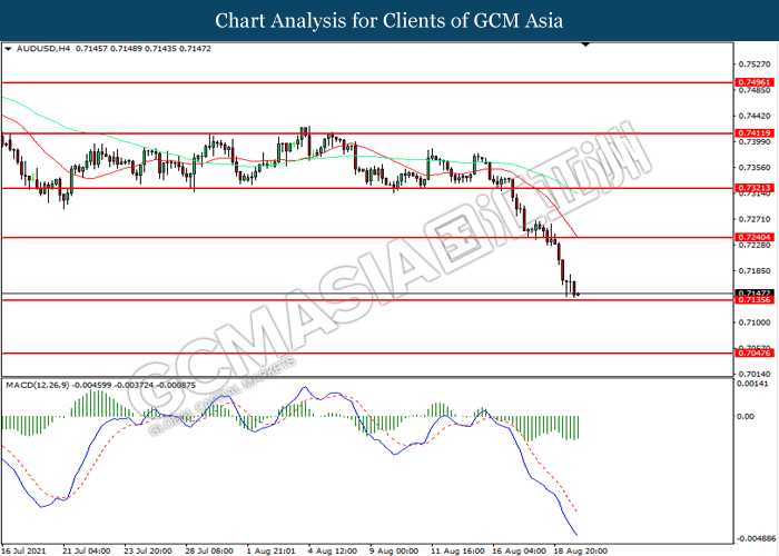 AUDUSD, H4: AUDUSD was traded lower following prior breakout below the previous support level at 0.7240. However, MACD which illustrated diminishing bearish momentum suggest the pair to be traded higher in short-term as technical correction.