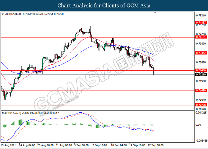 AUDUSD, H4: AUDUSD was traded lower following prior breakout below the previous support level 0.7250. MACD which illustrate ongoing bearish momentum signal suggest the pair to extend its losses towards the support level 0.7150.