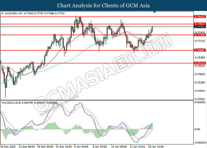 AUDUSD, H4: AUDUSD was traded higher while currently testing the resistance level at 0.7785. MACD which illustrated increasing bullish momentum suggest the pair to extend its gains after it successfully breakout above the resistance level.