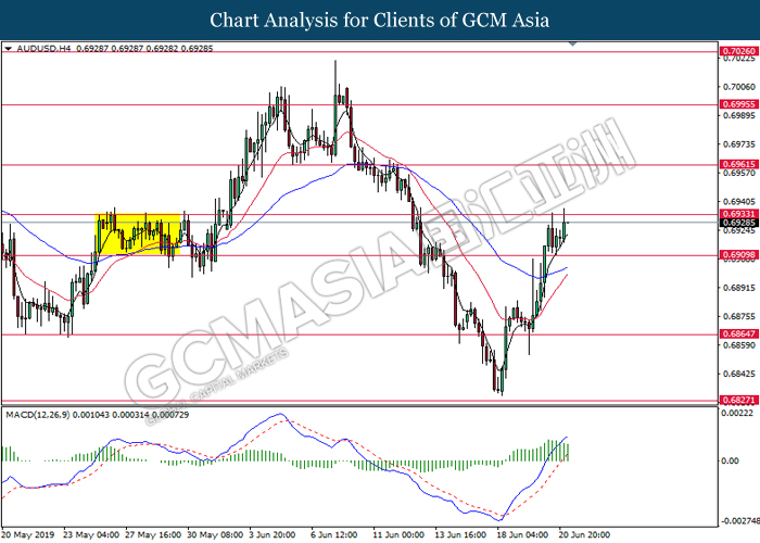 AUDUSD, H4: AUDUSD was traded higher while currently testing the resistance level at 0.6935. MACD which illustrate bullish bias momentum suggest the pair to extend its gains after successfully breakout above the resistance level at 0.6935.