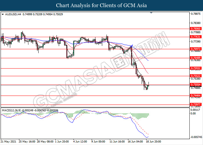 AUDUSD, H4: AUDUSD was traded higher while currently testing the resistance level 0.7505. MACD which illustrate diminishing bearish momentum signal suggest the pair to extend its rebound after it breaks above the resistance level.