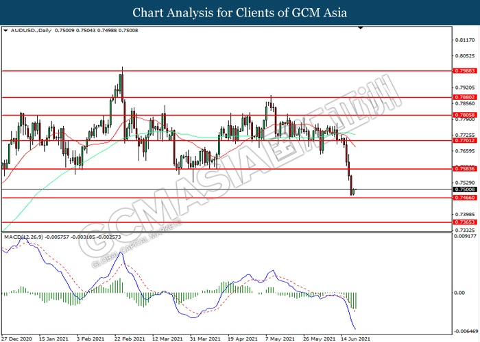 AUDUSD, Daily: AUDUSD was traded lower while currently testing the support level at 0.7465. MACD which illustrated increasing bearish momentum suggest the pair to extend its losses after it successfully breakout below the support level.