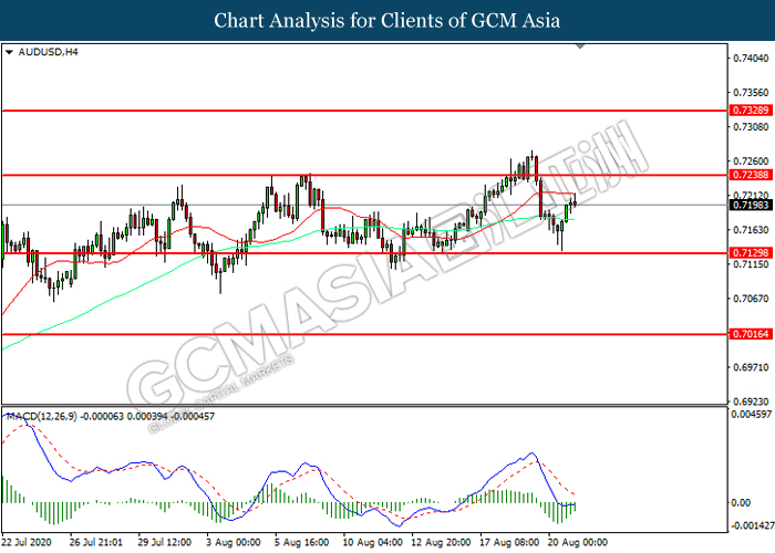AUDUSD, H4: AUDUSD was traded higher following prior rebound from the support level at 0.7130. MACD which illustrated diminishing bearish momentum suggest the pair to extend its gains toward resistance level at 0.7240.