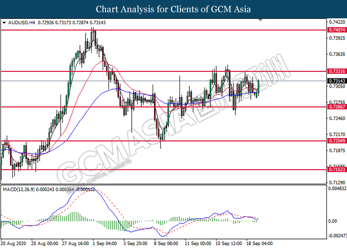 AUDUSD, H4: AUDUSD was traded higher following prior rebound from the lower level. MACD which illustrated diminishing bearish momentum suggest the pair to extend its gains toward the resistance level at 0.7330.