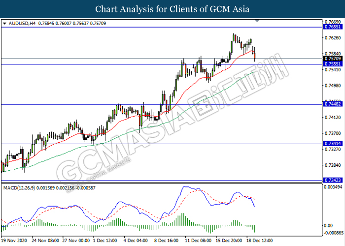 AUDUSD, H4: AUDUSD was traded lower while currently testing near the support level 0.7555. MACD which illustrate bearish momentum signal with the formation of death cross suggest the pair to extend its losses after it breaks below the support level.
