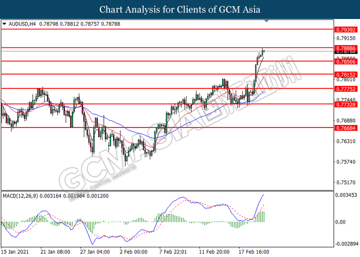 AUDUSD, H4: AUDUSD was traded higher while currently testing the resistance level at 0.7890. MACD which illustrated bullish bias momentum suggest the pair to extend its gains after it successfully breakout above the resistance level.