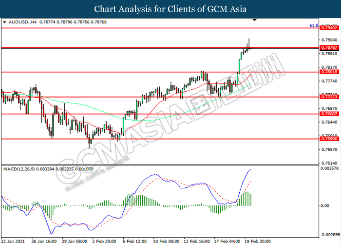 AUDUSD, H4: AUDUSD was traded higher while currently testing the resistance level at 0.7880. However, MACD which illustrated diminishing bullish momentum suggest the pair to be traded lower in short-term as technical correction.
